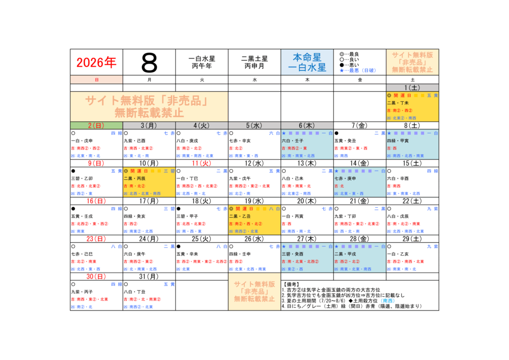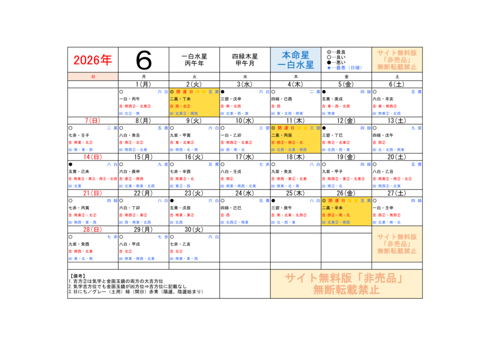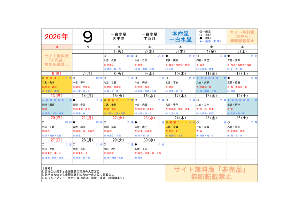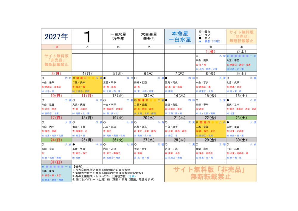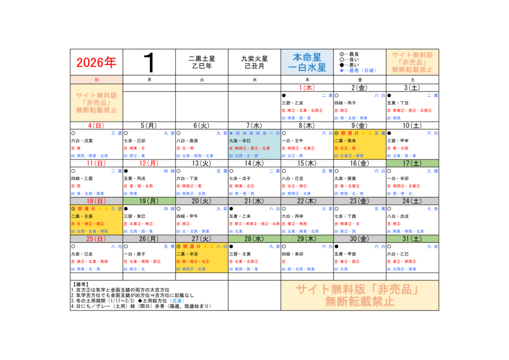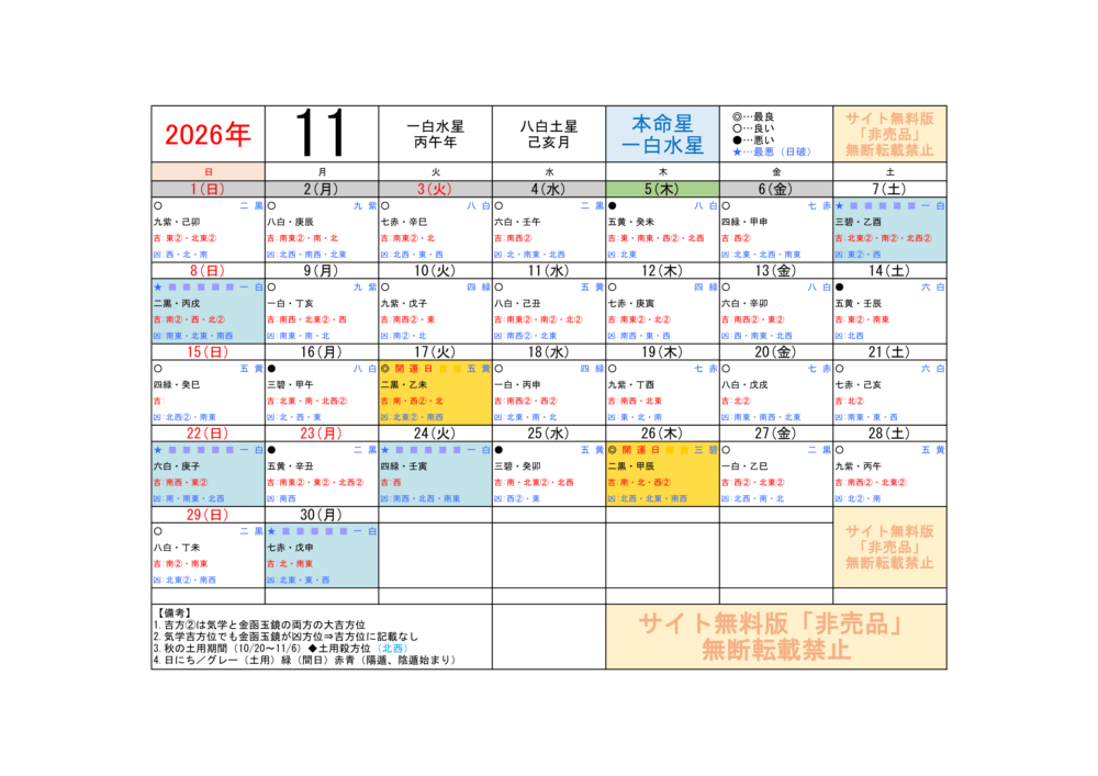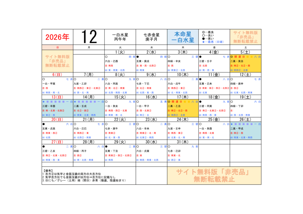 一白水星の生まれの方、カレンダーの運気と吉方位を日々の移動や行動に活かすことで幸運確率がアップします。毎日の「良い気」の積み重ねが、心身を安定させ幸運体質へとつながります。