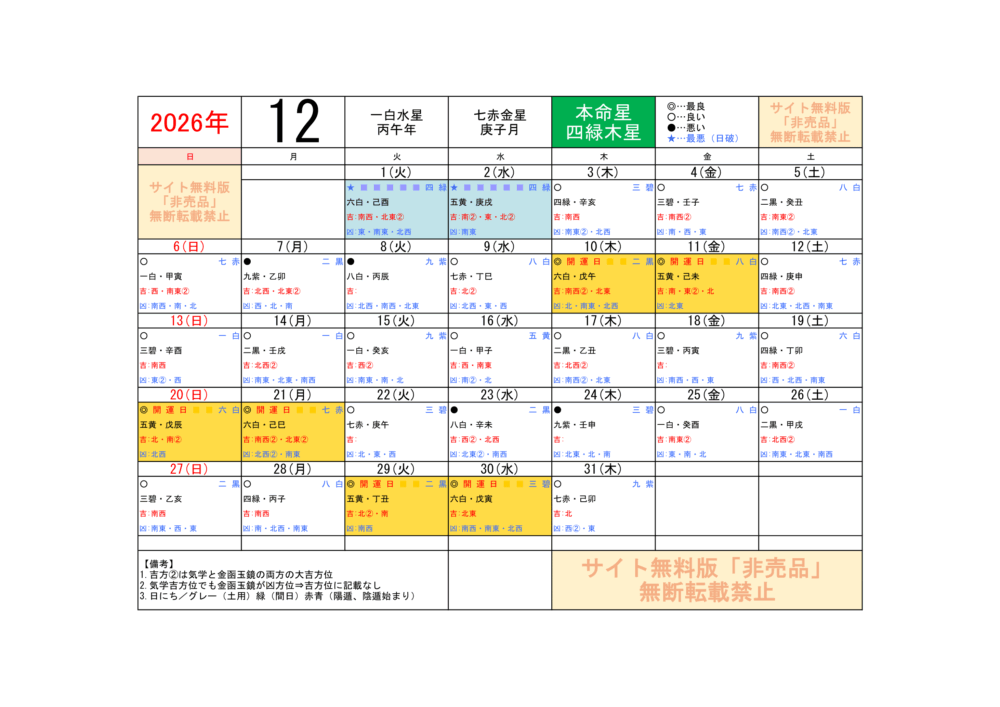 2026年12月/運気方位カレンダー