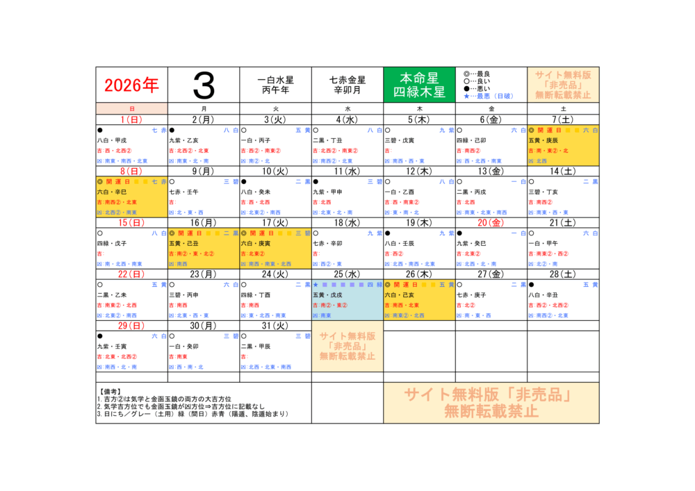 2026年3月/運気方位カレンダー