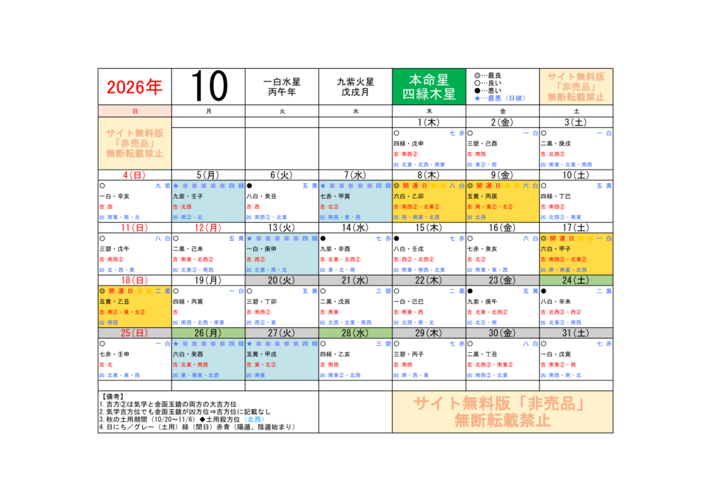 2026年10月/運気方位カレンダー