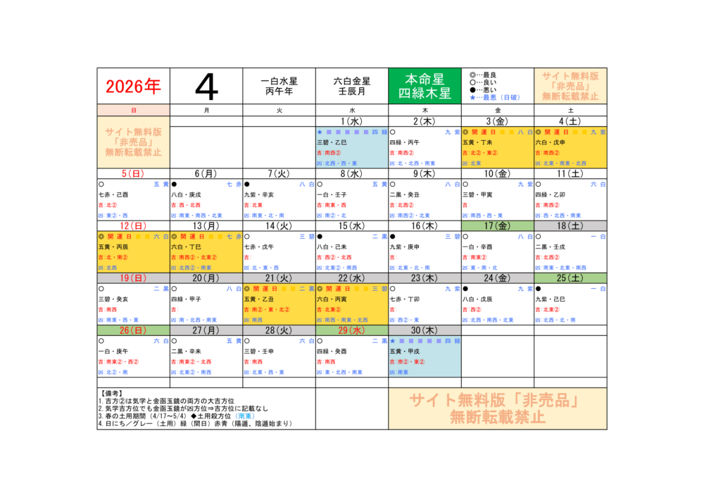 2026年4月/運気方位カレンダー