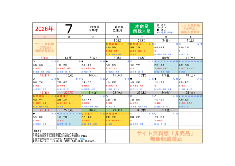 2026年7月/運気方位カレンダー