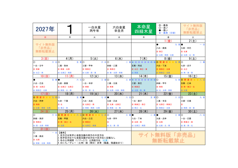 2027年1月/運気方位カレンダー