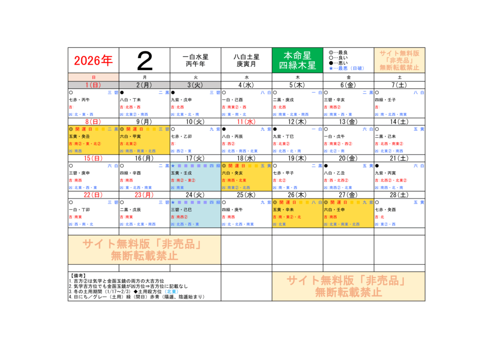 2026年2月/運気方位カレンダー