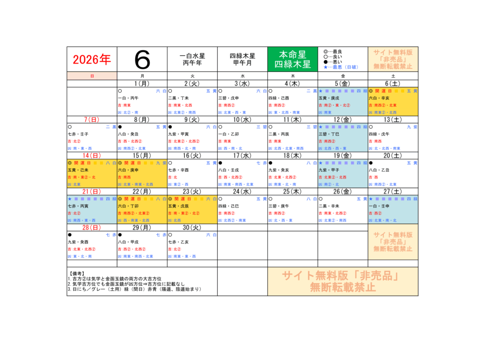 2026年6月/運気方位カレンダー