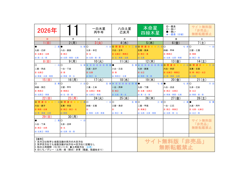 2026年11月/運気方位カレンダー