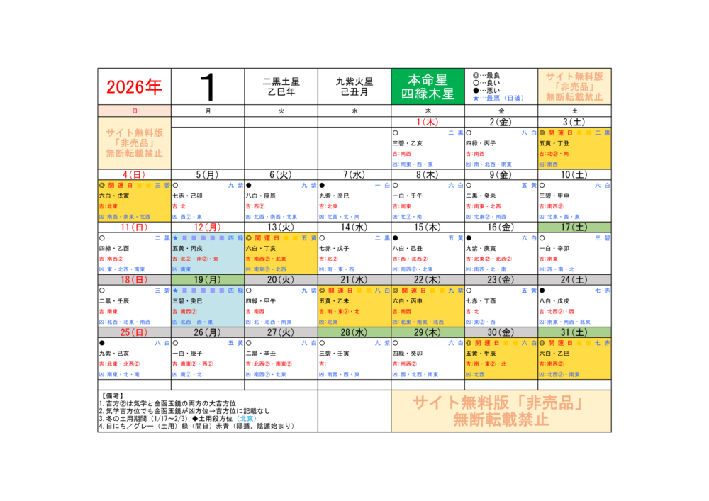 (2026年1月)運気方位カレンダー