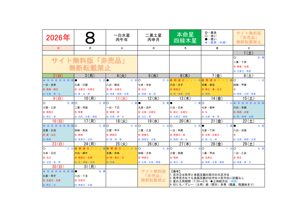 2026年8月/運気方位カレンダー