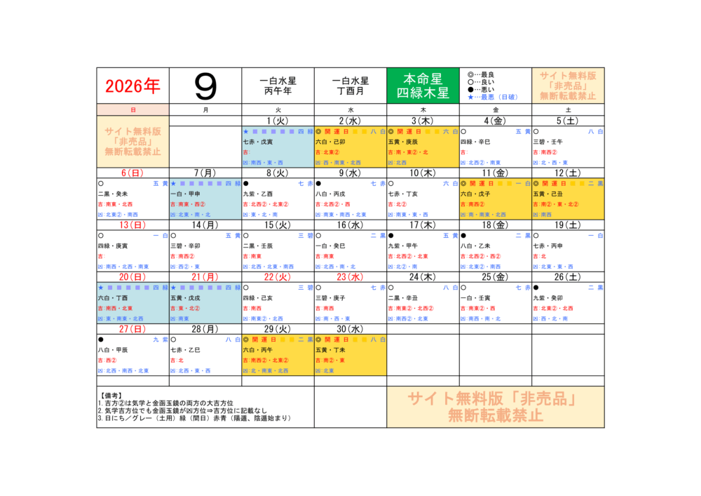2026年9月/運気方位カレンダー