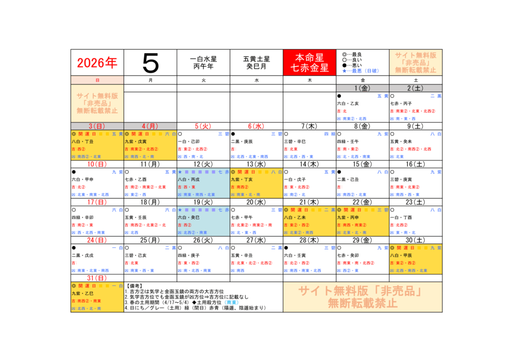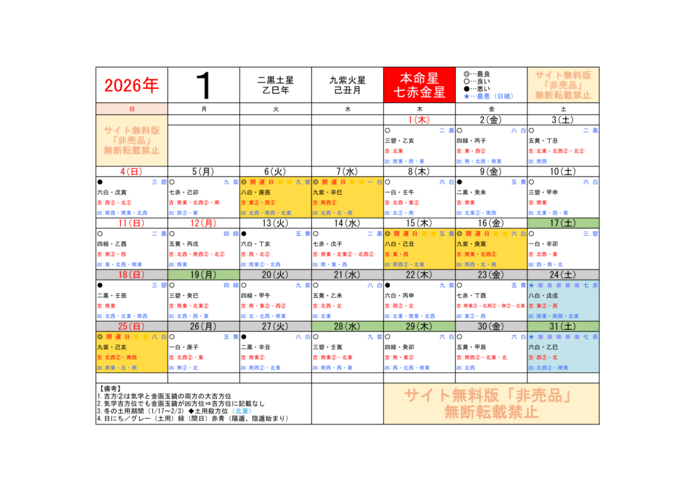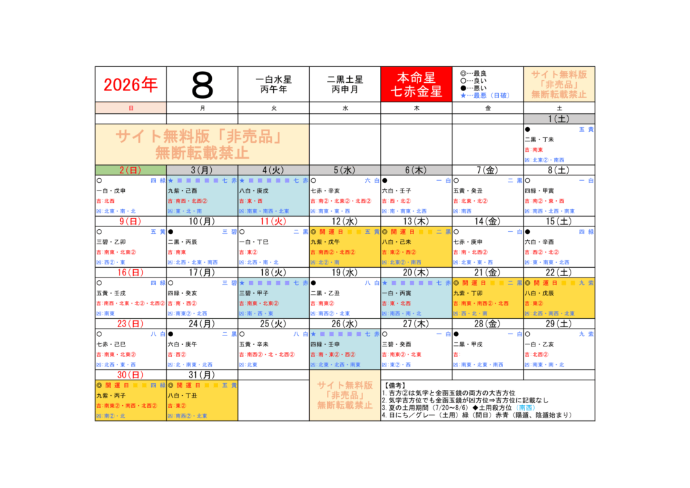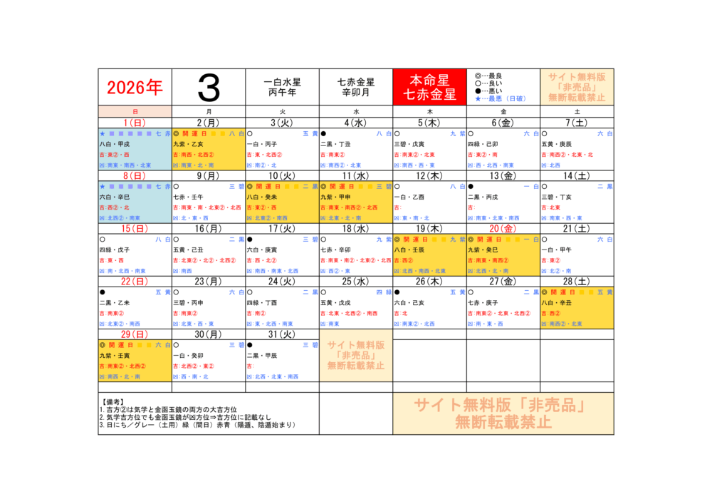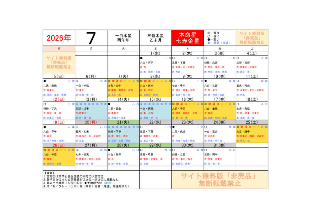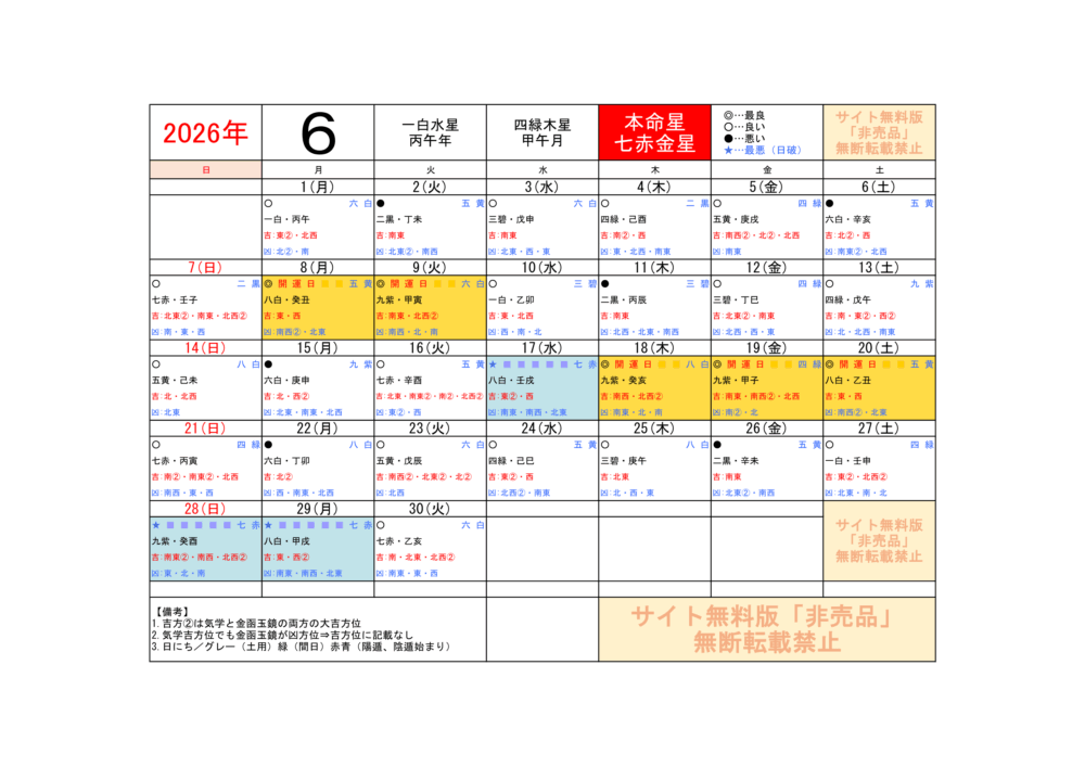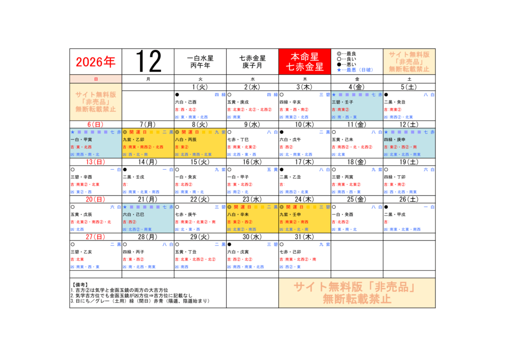 七赤金星の生まれの方、カレンダーの運気と吉方位を日々の移動や行動に活かすことで幸運確率がアップします。毎日の「良い気」の積み重ねが、心身を安定させ幸運体質へとつながります。