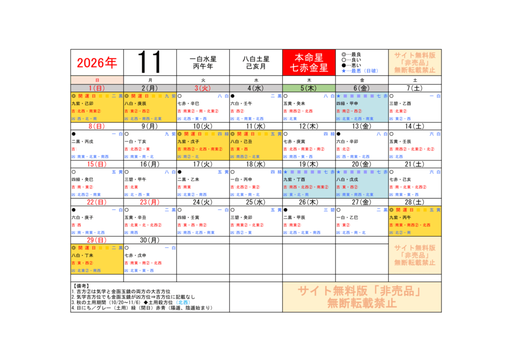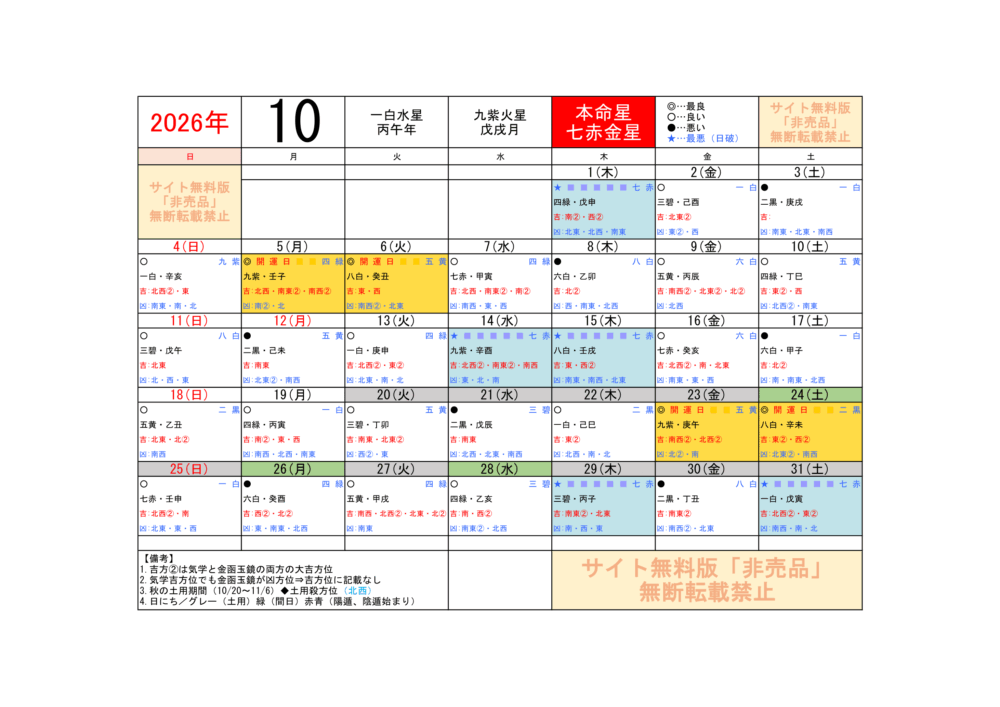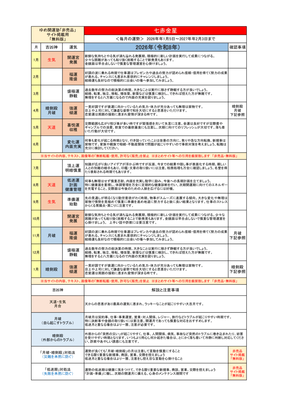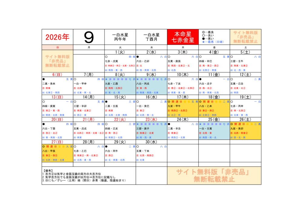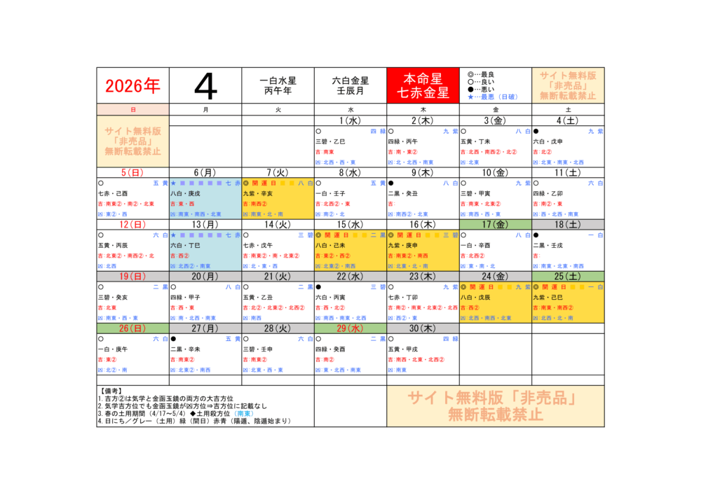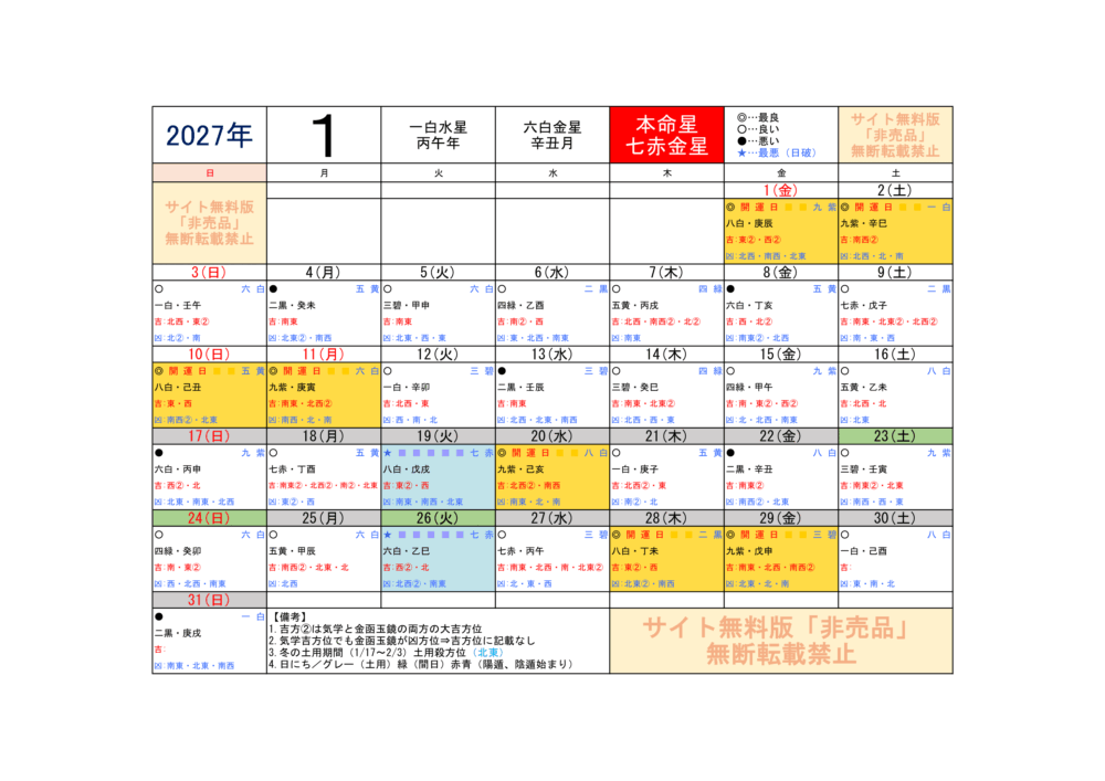 七赤金星の生まれの方、カレンダーの運気と吉方位を日々の移動や行動に活かすことで幸運確率がアップします。毎日の「良い気」の積み重ねが、心身を安定させ幸運体質へとつながります。