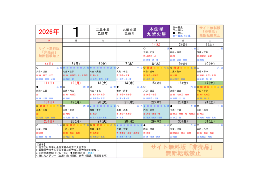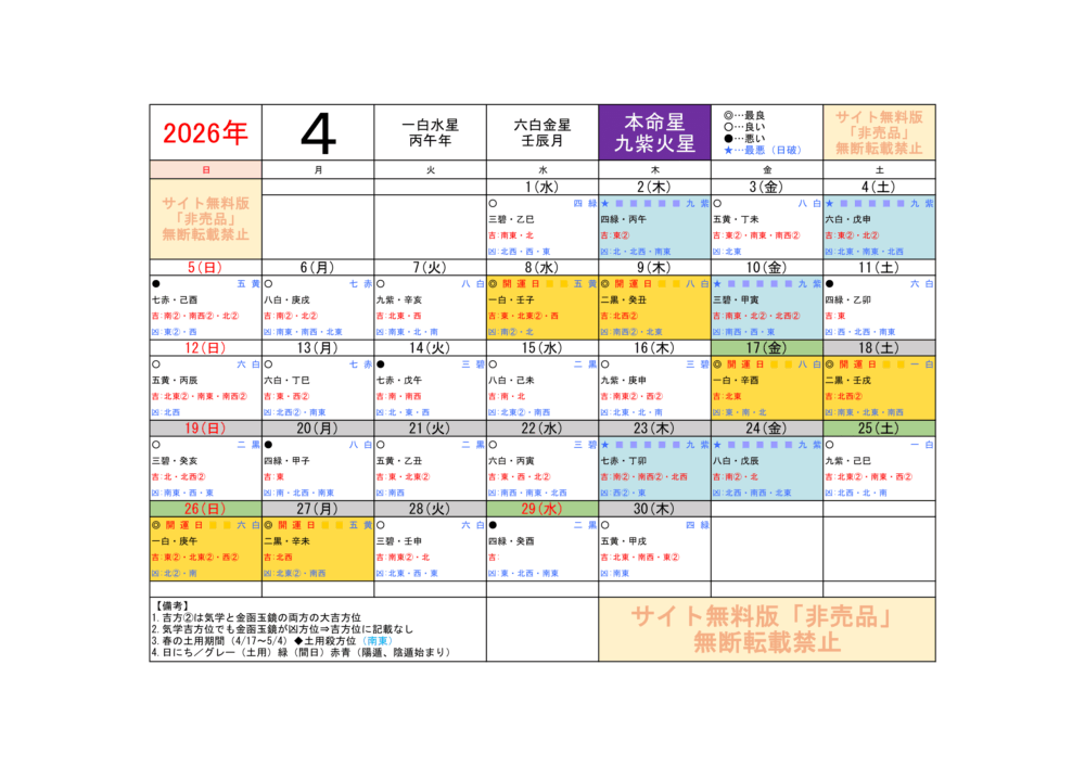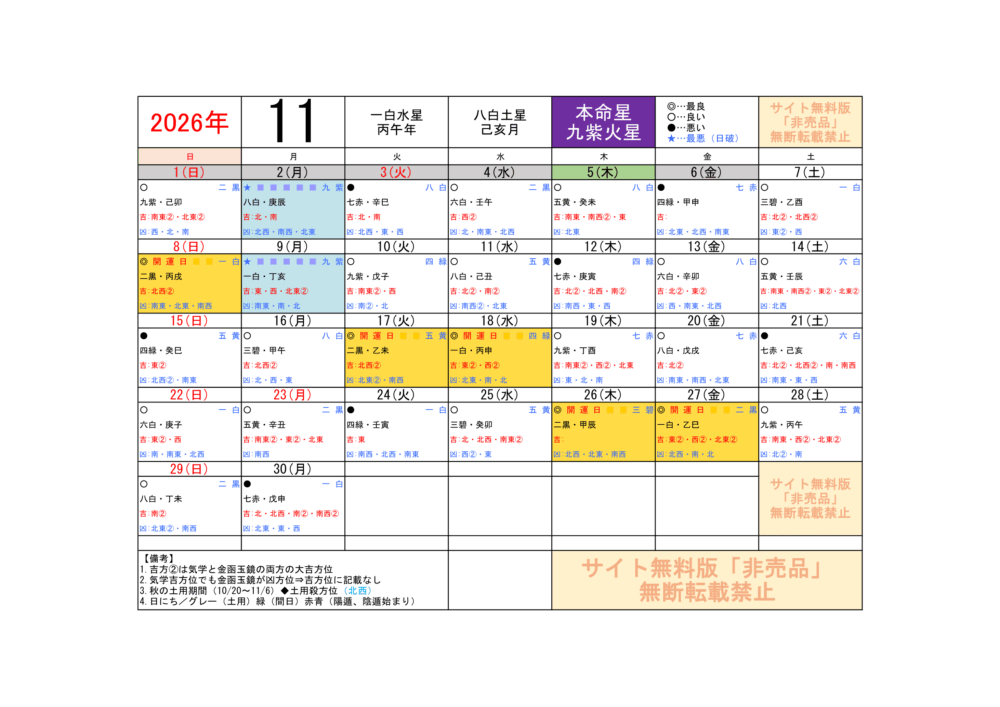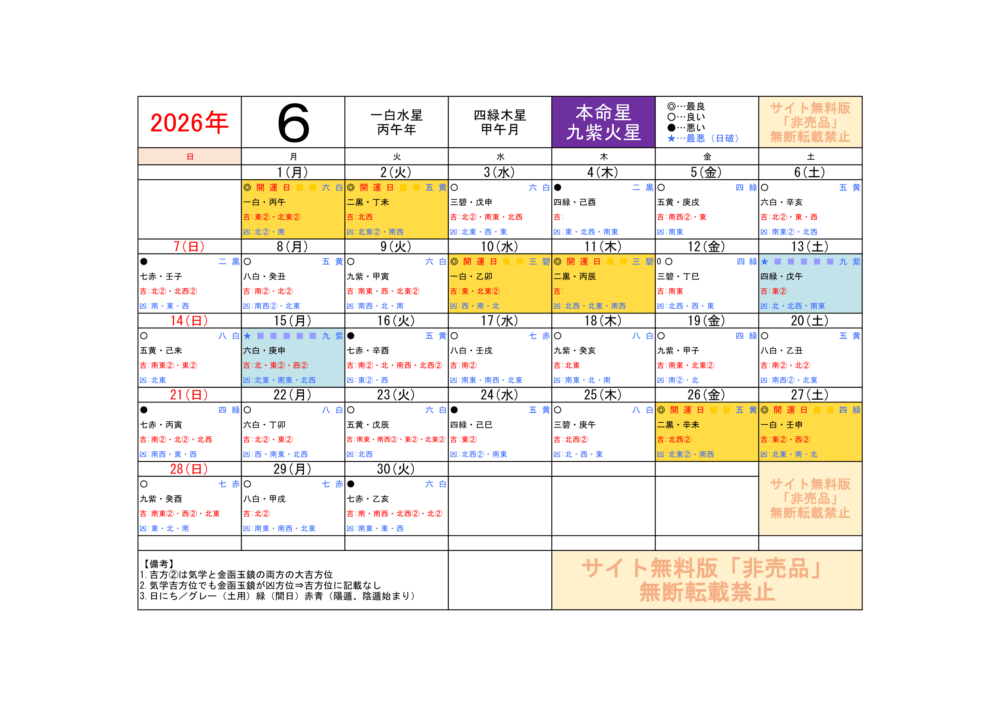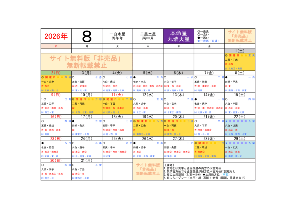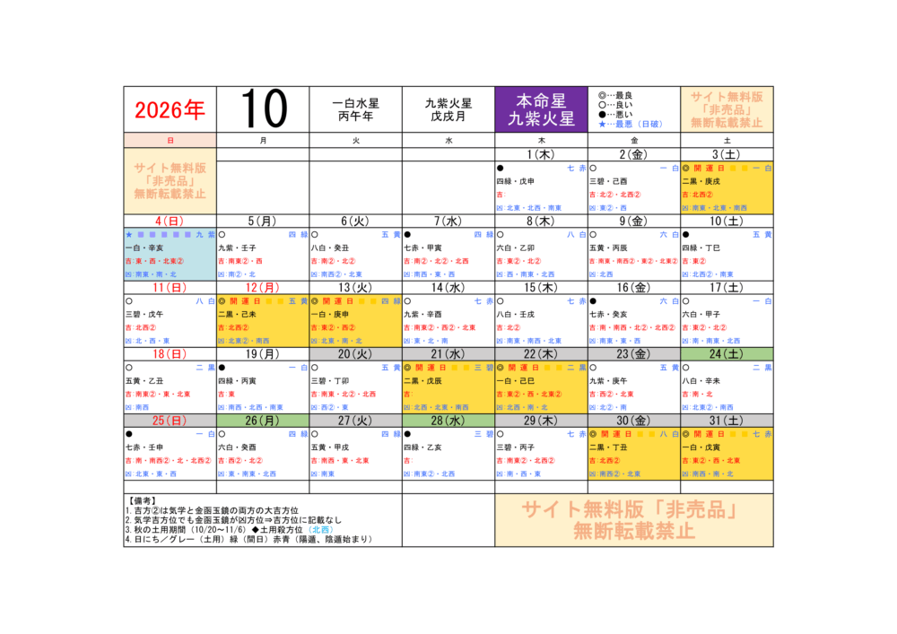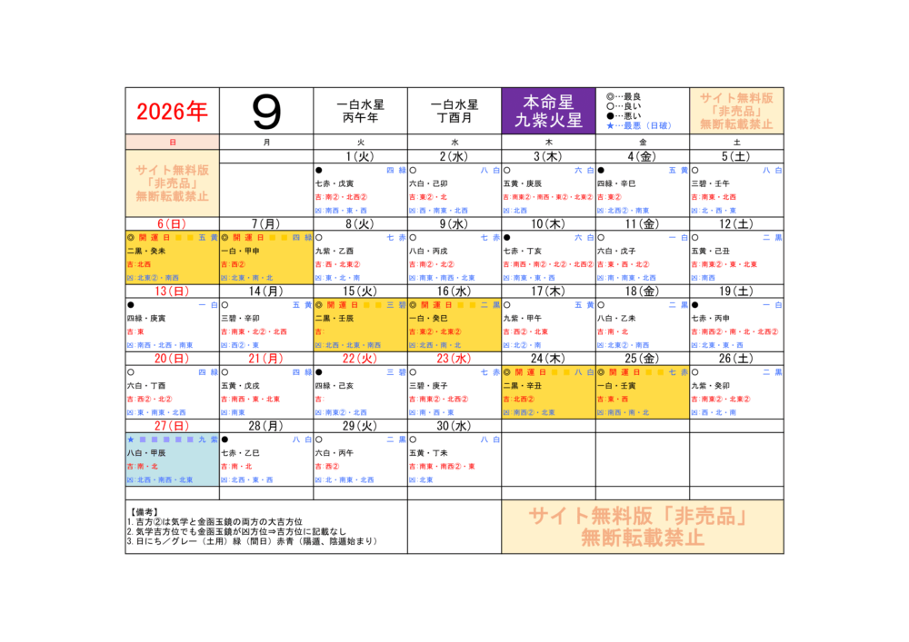 九紫火星の生まれの方、カレンダーの運気と吉方位を日々の移動や行動に活かすことで幸運確率がアップします。毎日の「良い気」の積み重ねが、心身を安定させ幸運体質へとつながります。