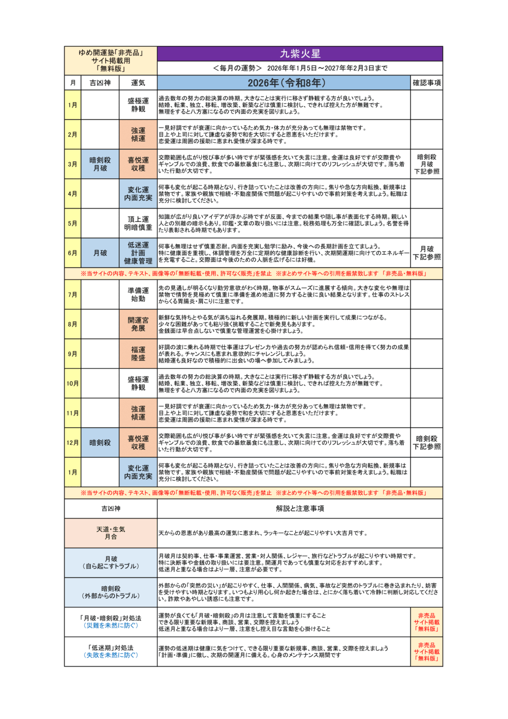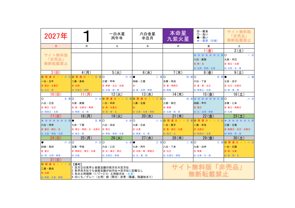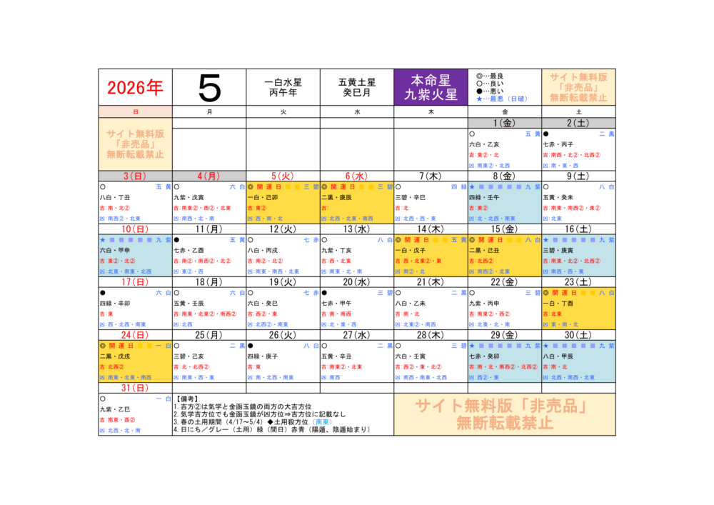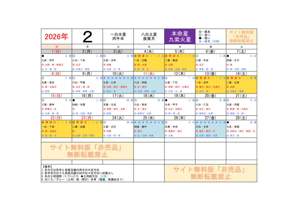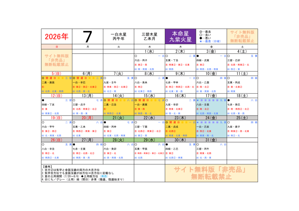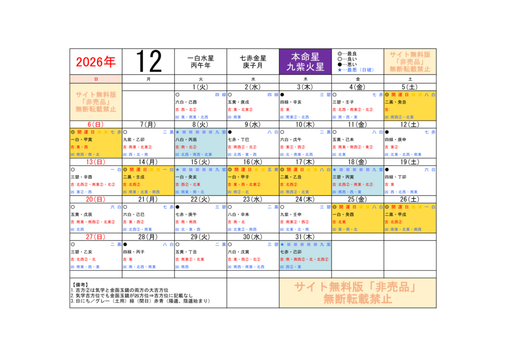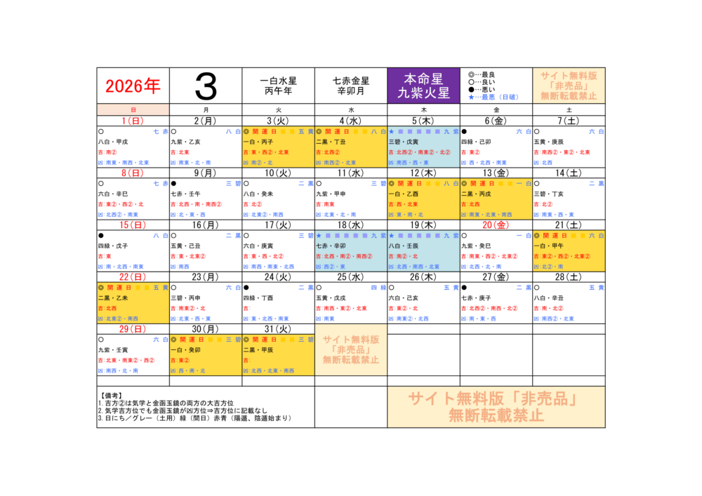 九紫火星の生まれの方、カレンダーの運気と吉方位を日々の移動や行動に活かすことで幸運確率がアップします。毎日の「良い気」の積み重ねが、心身を安定させ幸運体質へとつながります。